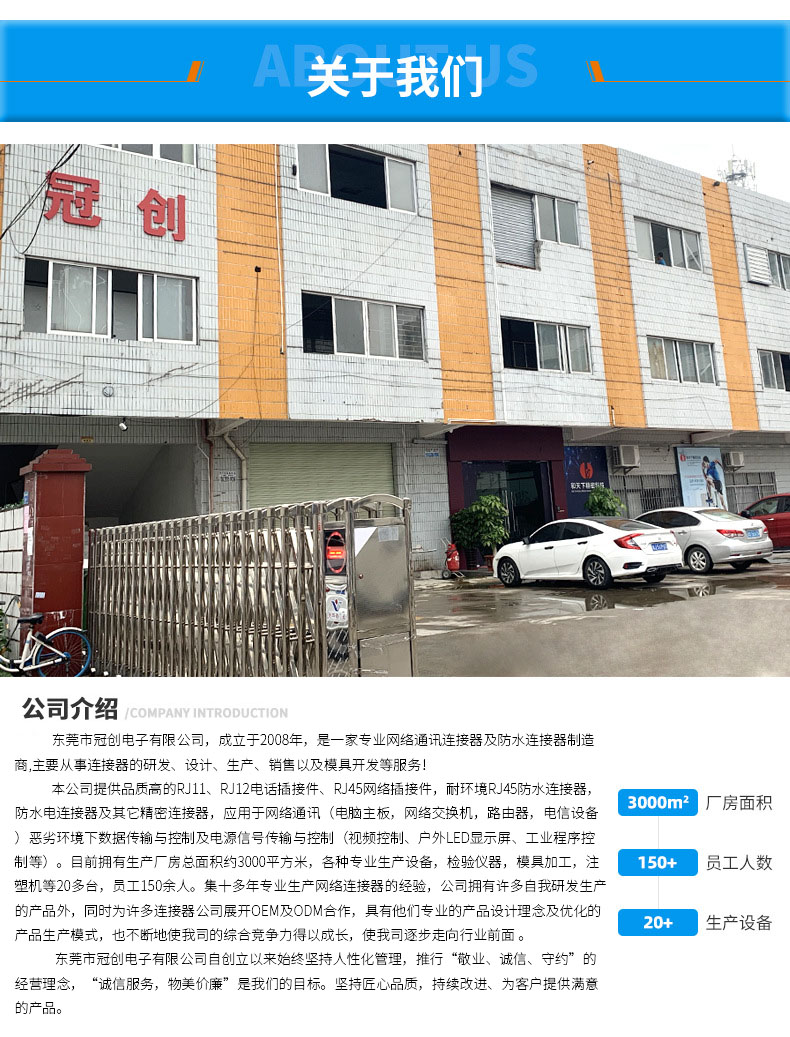 本公司提供優(yōu)良的RJ11、RJ12電話插接件、RJ45網(wǎng)絡(luò)插接件,耐環(huán)境RJ45防水連接器,防水電連接器及其它精密連接器,產(chǎn)品應(yīng)用于網(wǎng)絡(luò)通訊(電腦主板,網(wǎng)絡(luò)交換機(jī),路由器,電信設(shè)備)、惡劣環(huán)境下數(shù)據(jù)傳輸與控制及電源信號傳輸與控制(戶外LED顯示屏、機(jī)器控制、工業(yè)程序控制等)